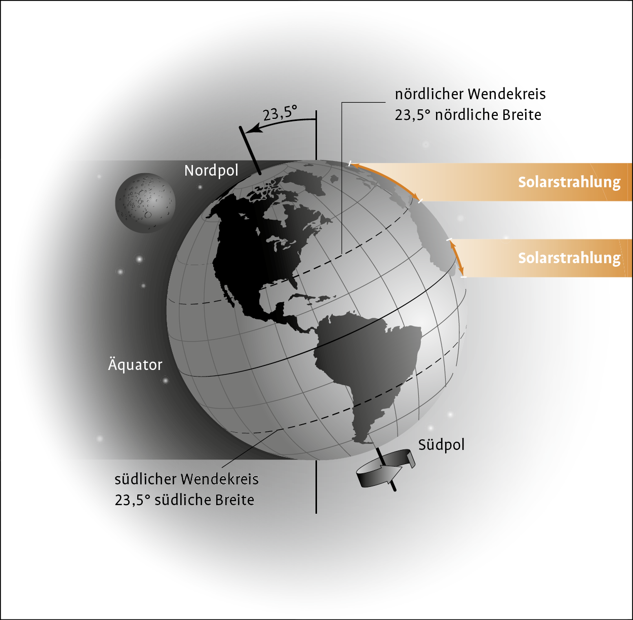 Der Großteil der klimatischen Unterschiede der Erde kommt durch die ungleiche Erwärmung der Erde durch die Sonne zustande. Die Erde rotiert um die Sonne und um ihre eigene Achse, die durch den Nord- und Südpol verläuft. Dabei steht die Erdachse nicht senkrecht zu ihrer Umlaufbahn um die Sonne, sondern ist um 23,5° geneigt (Schiefe der Ekliptik). Als Folge wird die Erdoberfläche ungleich durch die Sonne erwärmt. An den polnahen Regionen wird aufgrund des flacheren Einfallswinkels der Solarstrahlung das Strahlungsbündel über eine größere Fläche verteilt. Gleichzeitig muss die Strahlung der Sonne, wenn sie in einem flachen Winkel auf der Erde auftritt, eine Luftschicht mit einer größeren Zahl molekularer Teilchen durchdringen, welche die Sonnenstrahlen stärker reflektieren bzw. absorbieren. Im Bereich des Äquators hingegen trifft die Solarstrahlung mehr oder weniger senkrecht und über eine kleinere Fläche verteilt auf die Erdoberfläche. Der Energieeintrag pro Fläche ist daher deutlich höher. Dadurch sind die jährlichen Durchschnittstemperaturen in den Tropen nahe dem Äquator am höchsten und nehmen zu den Polen hin ab (s. Abb. 1.2). Die Schiefe der Erdachse führt zu einer unterschiedlichen Einstrahlung der Sonne auf die Nord- und Südhalbkugel und ist dadurch für die jahreszeitlichen Schwankungen von Temperatur und Tageslänge verantwortlich.