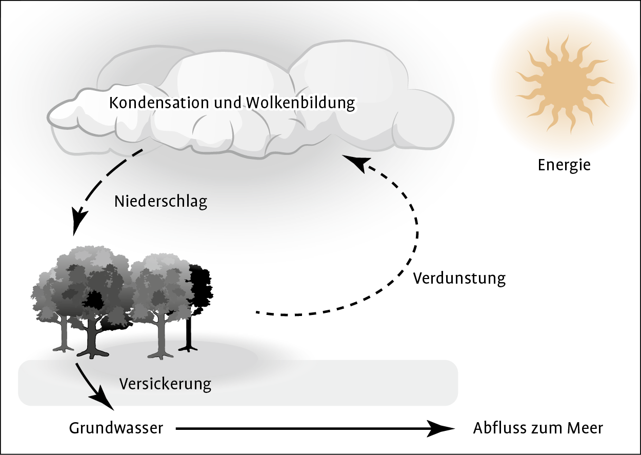 Beim globalen Wasserkreislauf gelangt Wasser von der Atmosphäre zur Erdoberfläche und dann wieder zurück in die Atmosphäre (s. Abb. 1.5). Treibende Kraft hierfür ist die Solarstrahlung, welche die Erdatmosphäre erwärmt und die erforderliche Energie für die Verdunstung des Wassers liefert. Der in der Atmosphäre zirkulierende Wasserdampf gelangt in Form von Niederschlag (Regen, Schnee, Hagel) zur Erdoberfläche zurück. Dabei fällt ein Teil des Wassers direkt auf Wasserflächen, ein Teil fällt auf die Erde und versickert und ein weiterer Teil wird von der Vegetation zurückgehalten. Die Benetzung der Pflanzen durch das Niederschlagswasser wird als Interzeption bezeichnet. Das versickernde Wasser sammelt sich zum Teil als Grundwasser, welches sich unterirdisch einen Weg zu Quellen und Bachläufen sucht und schließlich ins Meer gelangt. Durch Verdunstung des Wassers aus den oberen Erdschichten und von Wasserflächen (Evaporation) und der Verdunstung durch die Pflanzen (Transpiration) kehrt das Wasser wieder in die Atmosphäre zurück.